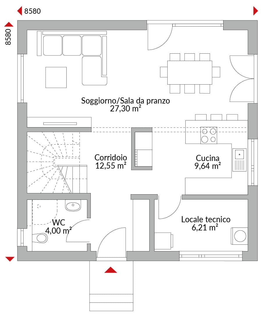Casa a due piani con tre camere, ingresso, cucina, locale tecnico, WC, ampia zona giorno open space con area pranzo, scala e accesso all’esterno, camera padronale con bagno privato e cabina armadio, due camere singole, bagno principale, ripostiglio.
