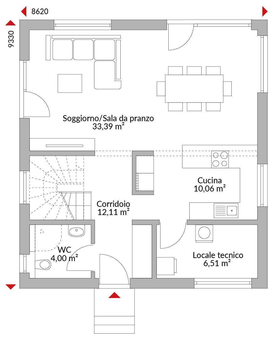 Casa a due piani con tre camere, ingresso con scala e guardaroba, bagno di servizio, cucina, dispensa, locale tecnico, zona giorno open space con area pranzo e accesso all’esterno, camera padronale con bagno privato e cabina armadio, due camere singole, bagno principale.
