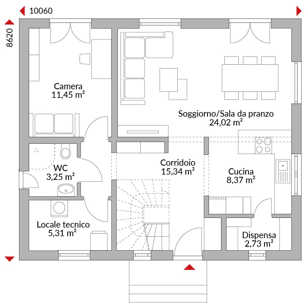 Villa a due piani con quattro camere da letto, cucina open-space, dispensa, ampia zona soggiorno/pranzo, bagno di cortesia, locale tecnico ed ingresso. Bagno e cabina armadio al piano superiore. Tetto a quattro falde (anche detto a padiglione) con pendenza di 22°.
