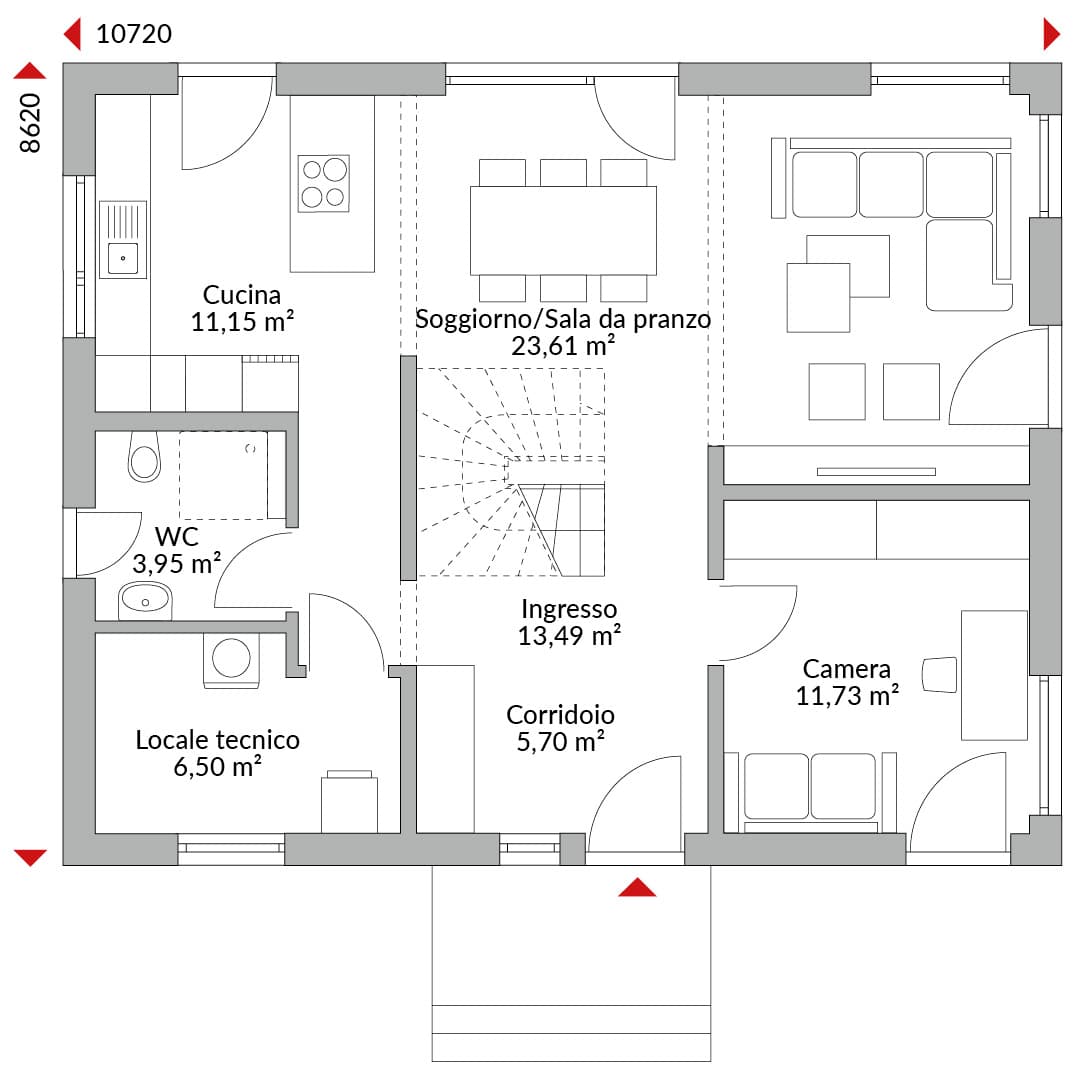 Villa a due piani con quattro camere da letto, cucina open-space, ampia zona soggiorno/pranzo, guest WC, locale tecnico ed ingresso con area guardaroba. Bagno e cabina armadio al piano superiore. Tetto a quattro falde (anche detto a padiglione) con pendenza di 22°.