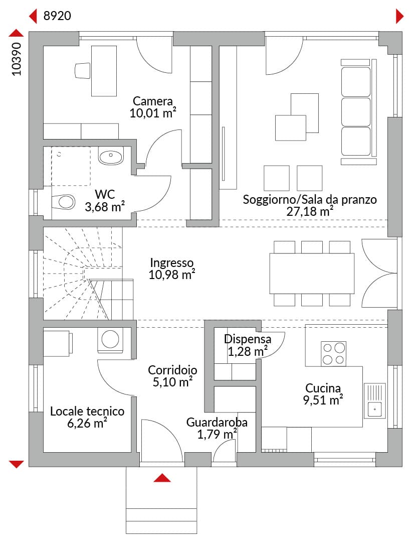 Villa a due piani con quattro camere da letto, cucina open-space, dispensa, ampia zona soggiorno/pranzo, bagno di cortesia, locale tecnico ed ingresso. Bagno e cabina armadio al piano superiore. Tetto a quattro falde (anche detto a padiglione) con pendenza di 22°.