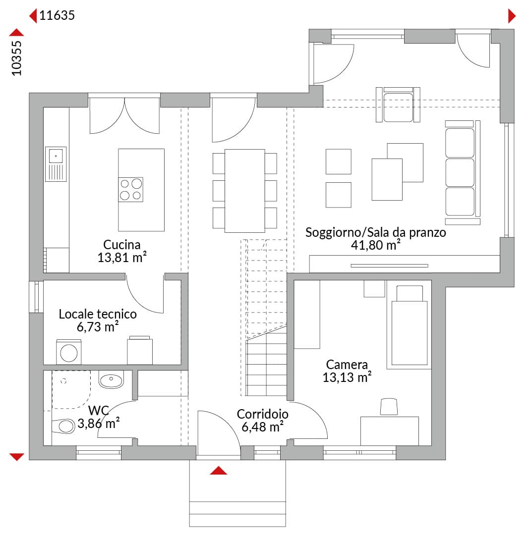 Villa a due piani con quattro camere da letto, cucina open-space, ampia zona soggiorno/pranzo, bagno di cortesia, locale tecnico ed ingresso. Bagno e cabina armadio al piano superiore. Tetto a quattro falde (anche detto a padiglione) con pendenza di 22°.
