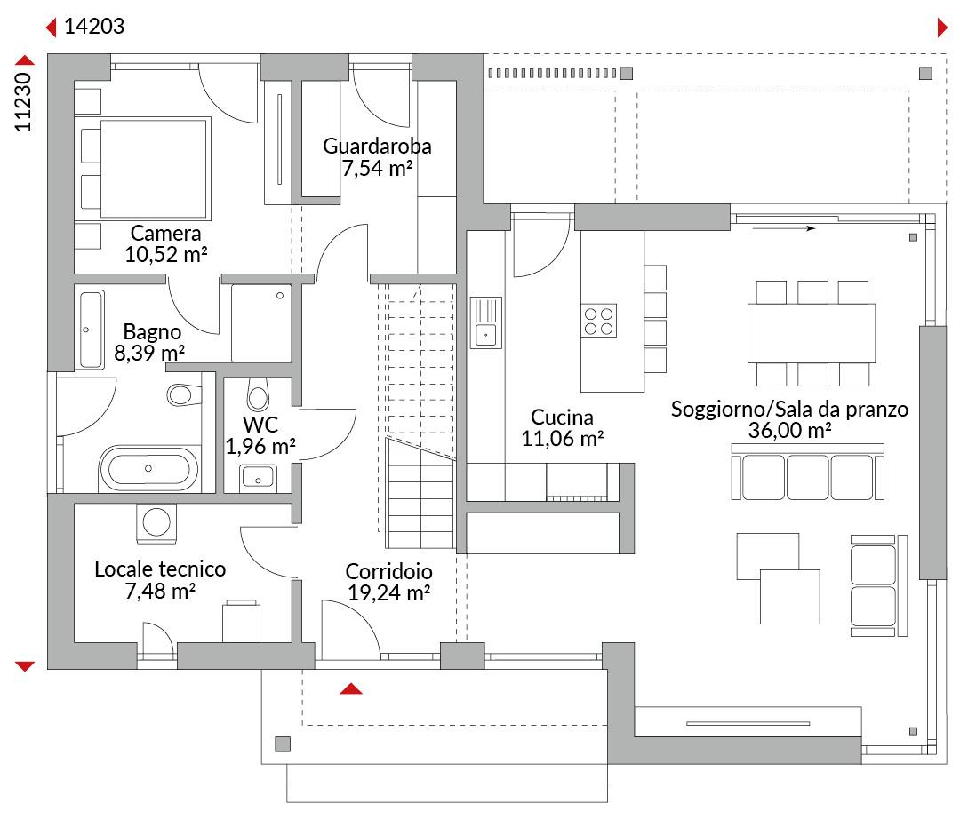 Casa a due piani con pensilina sull'ingresso principale rialzato e bovindo angolare; l'ingresso è dotato di scala a vista; la zona giorno open-space presenta vetrate a tutta altezza e porte scorrevoli con accesso alla terrazza; la cucina è dotata di penisola con piano cottura; locale tecnico; bagno di cortesia; la camera padronale è provvista di cabina armadio e bagno privato; un disimpegno aperto; due camere singole con area armadio; uno studio/ufficio; e un bagno con ripostiglio; un tetto a quattro falde con ampi sporti di gronda di 60 cm e pendenza di 22° .