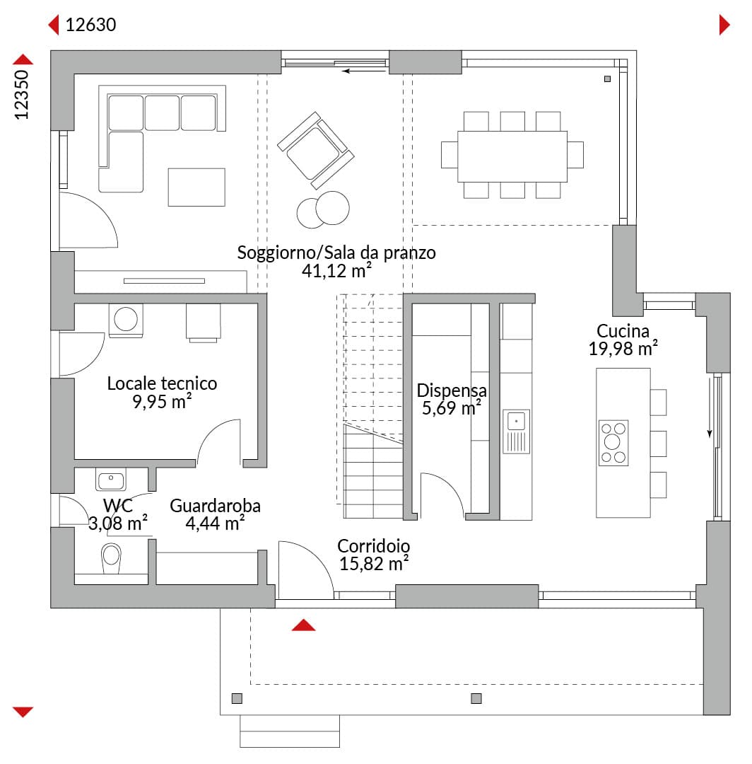 Casa a due piani con ampia pensilina sopra la porta d’ingresso rialzata e bovindo d’angolo lineare; tre camere da letto al piano superiore; doppia altezza nella zona giorno; ampio disimpegno; camera padronale con bagno privato con doccia e cabina armadio; secondo bagno con vasca e doccia; piano terra rialzato con vetrate d’angolo nella zona pranzo e finestre a tutta altezza, concepito come zona giorno open space con cucina/pranzo/soggiorno e porte scorrevoli con accesso diretto alla terrazza; dispensa separata; bagno di cortesia; locale tecnico e disimpegno; tetto a quattro falde con sporti di 60 cm e inclinazione di 22°.