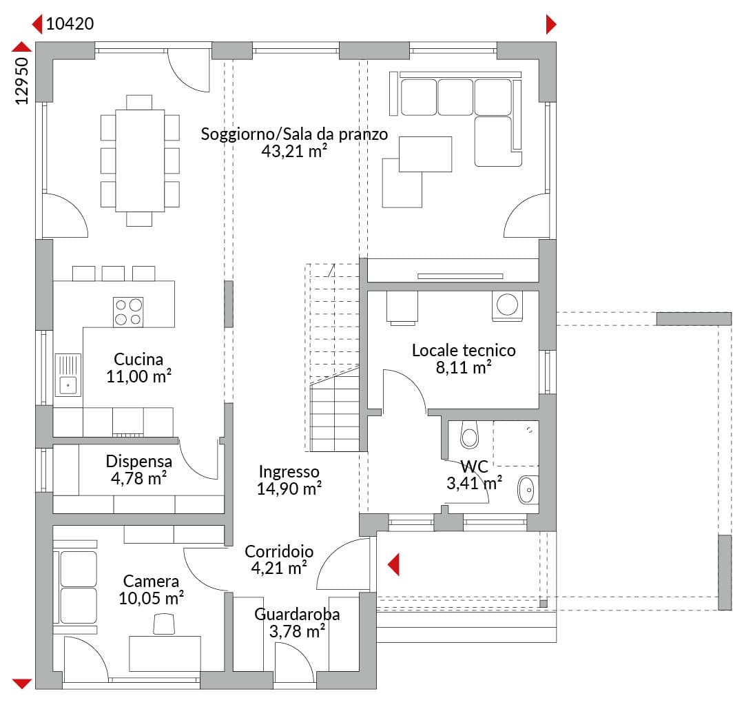 Villa a due piani con tre camere da letto, ingresso con disimpegno, atrio con scala, ampia zona giorno open space soggiorno/pranzo, cucina con isola centrale, dispensa, studio/ufficio, locale tecnico, bagno di servizio, camera matrimoniale con cabina armadio e bagno privato, due camere singole, bagno con doccia e ripostiglio, tetto a quattro falde con inclinazione di 22°.