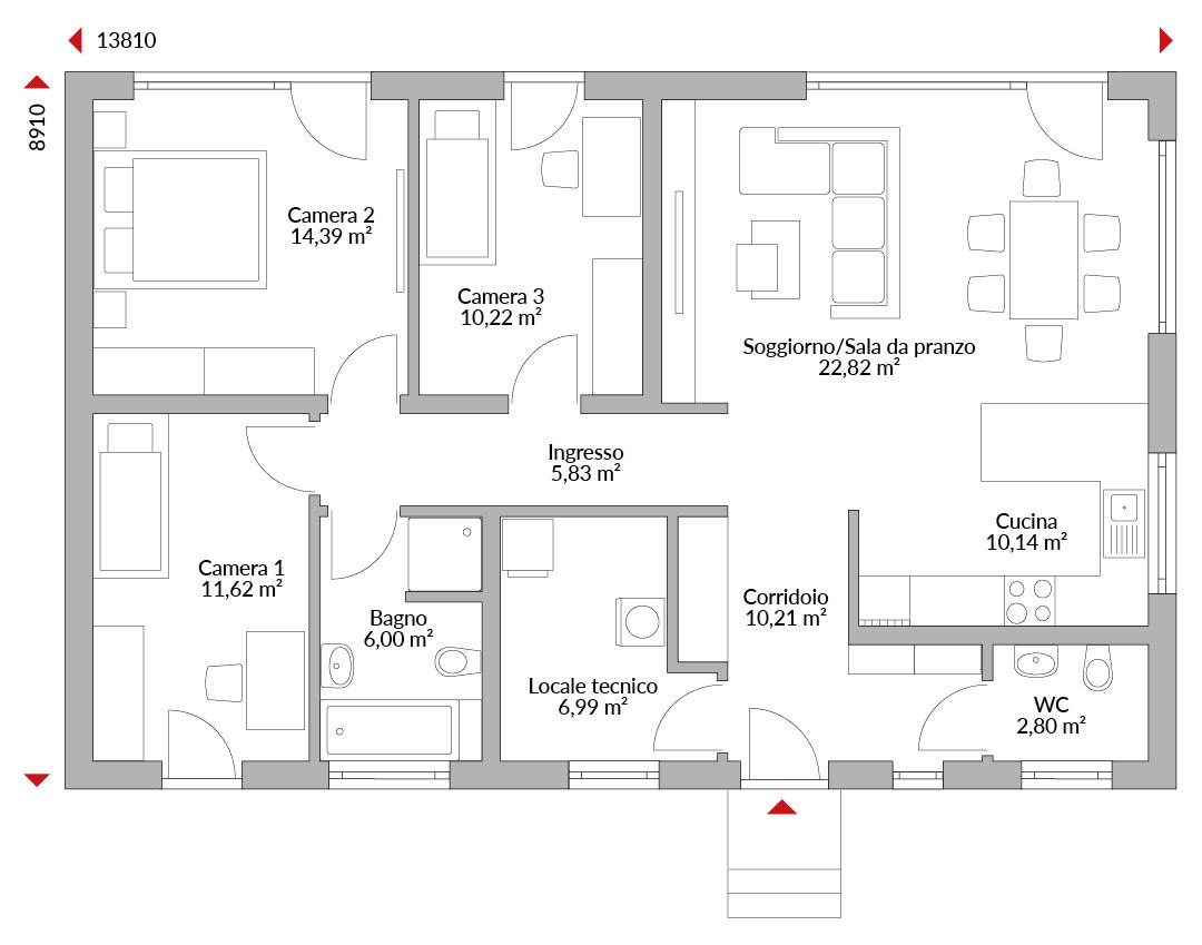 Casa su un piano con tre camere da letto, zona soggiorno/pranzo/cucina open space, ingresso, bagno con doccia, locale tecnico, WC, tetto a due falde con pendenza di 25°.