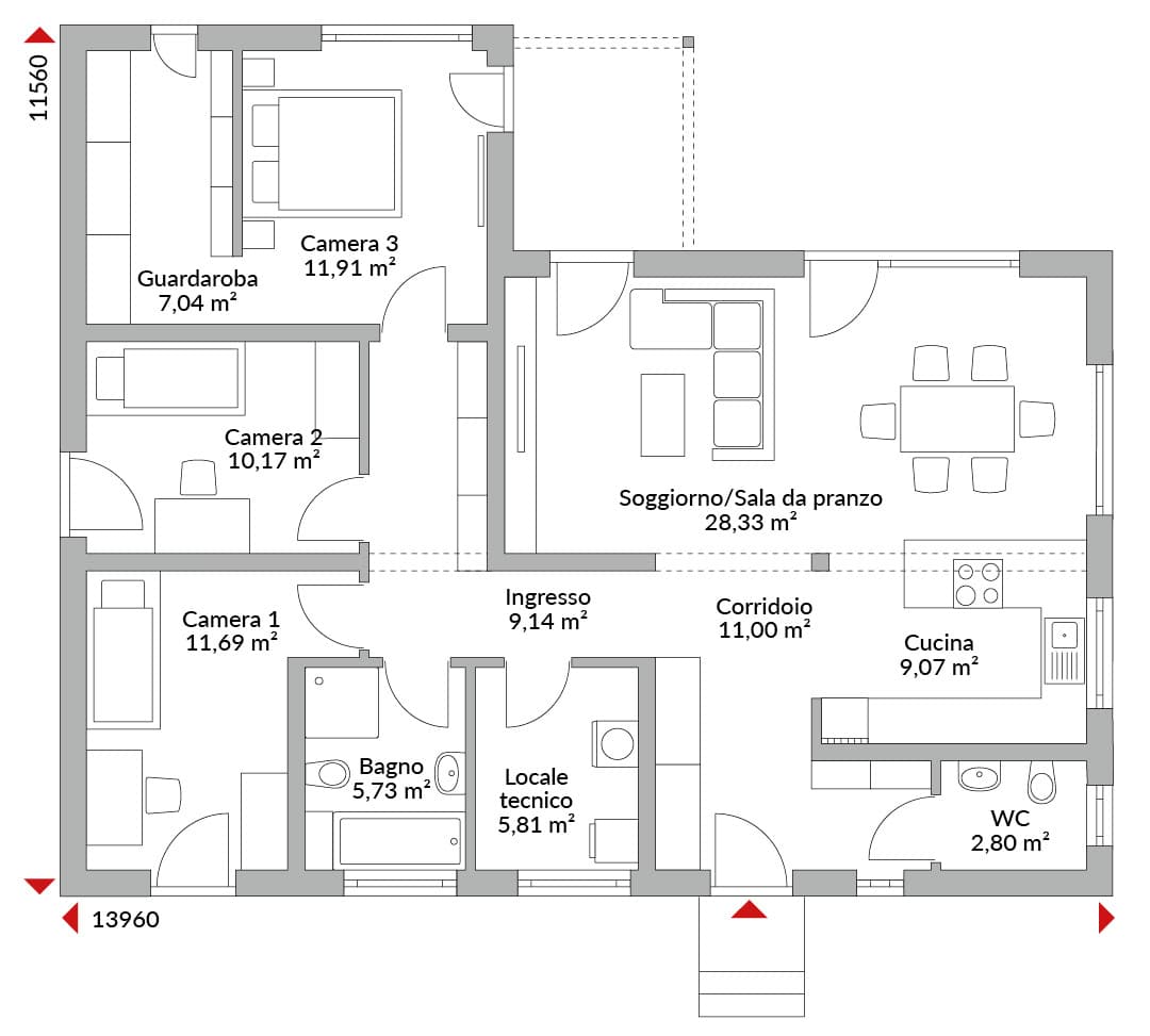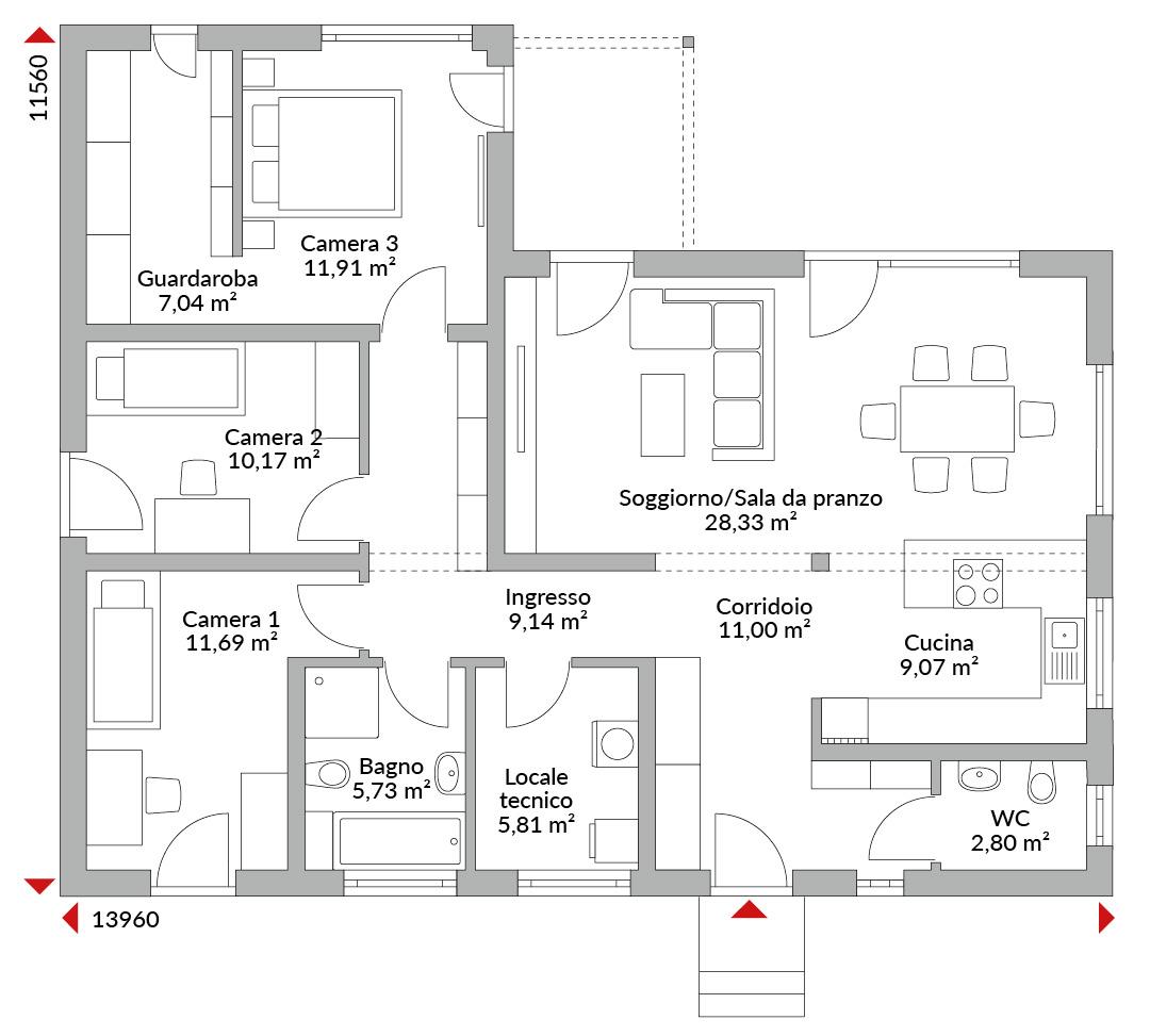 Casa su un piano con tre camere da letto, guardaroba, ingresso, zona soggiorno/pranzo/cucina open space, bagno con doccia, locale tecnico, WC, tetto a due falde con pendenza di 22°.