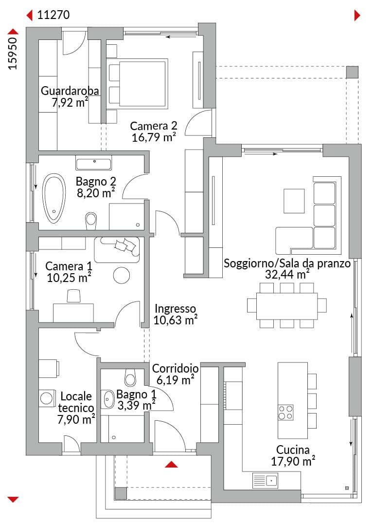 Casa su un piano con pianta ad L, due camere da letto con ingresso preceduto da alcuni gradini e camera padronale dotata di cabina armadio. Bagno con vasca da bagno, doppio lavabo e doccia. Zona giorno al piano terra rialzato con vetrata d’angolo e finestre più alte, progettata come un ampio ambiente open space con cucina, soggiorno e sala da pranzo, dotato di porte scorrevoli che si aprono sulla terrazza. Bagno di cortesia, locale tecnico e disimpegno. Il tetto a quattro falde con ampi sporti di gronda (60 cm) e una pendenza di 25°, con copertura integrata sopra ingresso e terrazza.