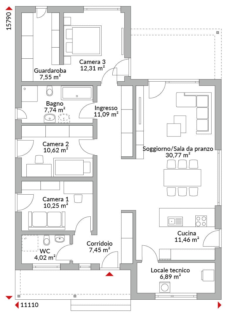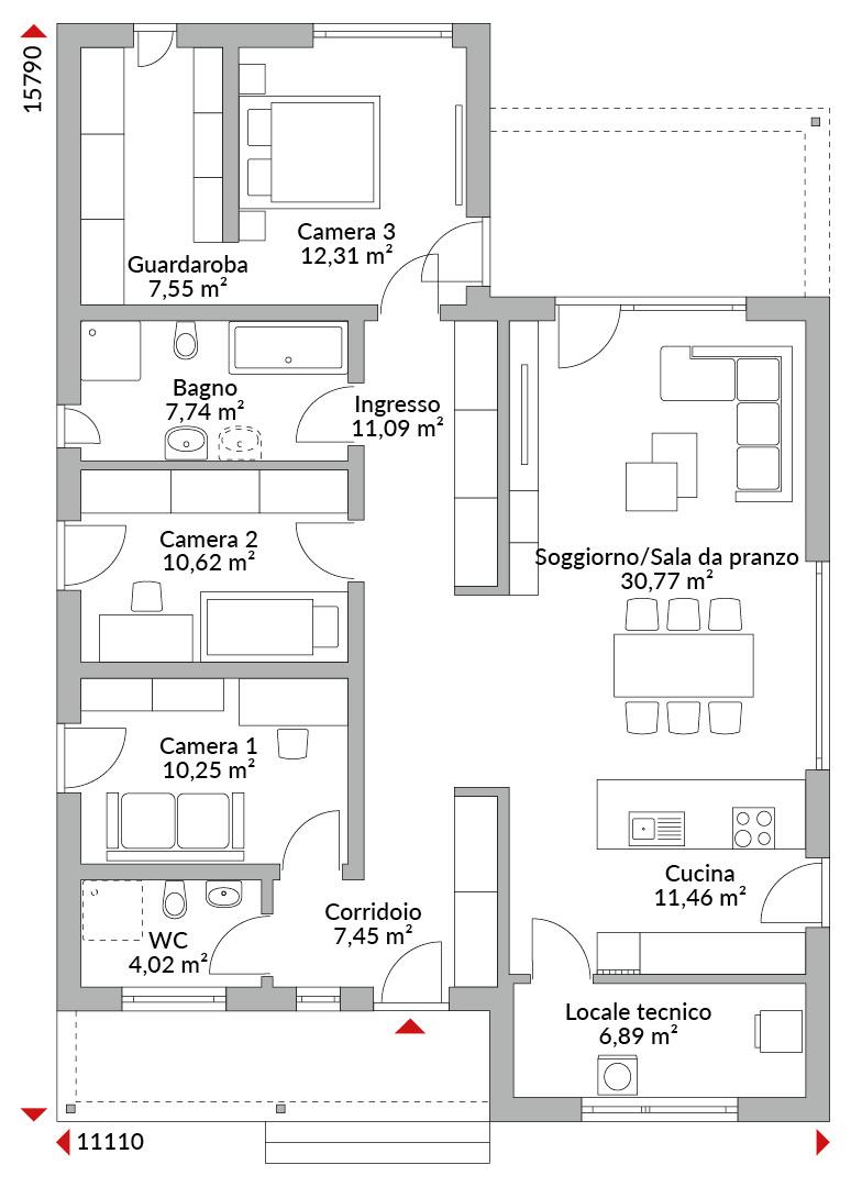 Casa su un piano con pianta ad L, tre camere da letto con cabina armadio, cucina open space, due bagni, bagno di cortesia, dispensa, locale tecnico, disimpegno e spazioso ingresso. Tetto piano con copertura integrata sopra ingresso e terrazza.