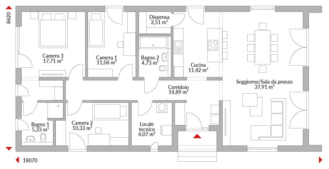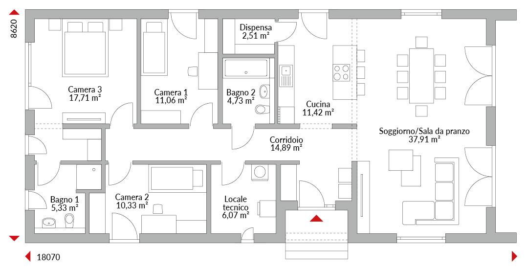 Casa su un piano con tre camere da letto, ingresso con disimpegno, locale tecnico, zona giorno open space con area pranzo e accesso all’esterno, cucina adiacente, camera padronale con bagno privato e cabina armadio, bagno principale e ripostiglio.