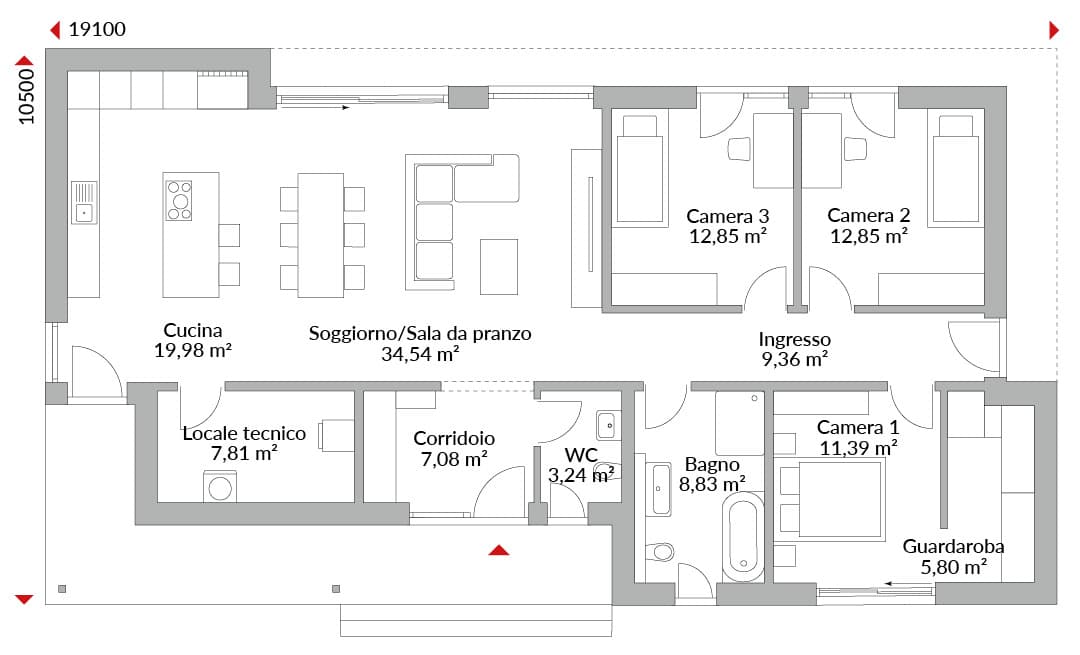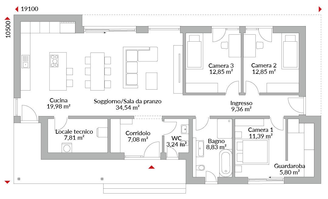 Casa su un piano con tre camere da letto con ingresso completamente coperto e porta d’ingresso preceduta da alcuni gradini con pannello in vetro. Comodo accesso alla cucina anche dall’esterno. Piano terra rialzato con finestre a tutta altezza, concepito come cucina open space con zona giorno e pranzo adiacente e porte scorrevoli sulla terrazza. Tetto a quattro falde senza sporti, con inclinazione di 25°.