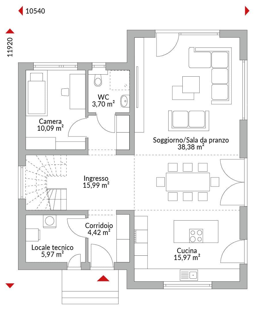 Casa su un piano con due camere, cucina open space, dispensa, bagno, bagno di cortesia, ingresso e locale tecnico. Zona pranzo aperta fino al tetto. Tetto a una falda con inclinazione di 25°.