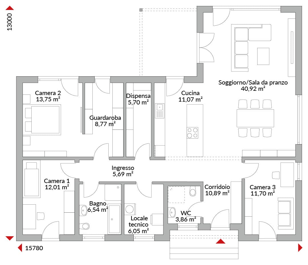 Casa su un piano con pianta ad L, tre camere da letto con cabina armadio, cucina open space, dispensa, bagno, bagno di cortesia, locale tecnico, ingresso e disimpegno. Pensilina integrata sopra l’ingresso e la terrazza. Tetto a quattro falde (anche detto a padiglione) con pendenza di 25°.