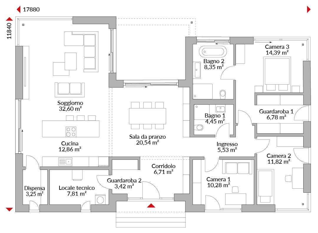 Casa su un piano con pianta ad L con pensilina integrata sopra l'ingresso preceduto da alcuni gradini e pannelli laterali in vetro. La camera padronale è dotata di bagno privato che include vasca da bagno indipendente, doppio lavabo e doccia. Sono presenti anche due guardaroba separati, di cui uno utilizzabile come cabina armadio. La zona giorno al piano terra rialzato, caratterizzata da vetrate angolari e finestre più alte, è concepita come uno spazio open-space che unisce cucina, soggiorno e sala da pranzo, con porte scorrevoli che conducono alla terrazza. Completano gli spazi interni: una dispensa, un bagno per gli ospiti con doccia, un locale tecnico, l'area d'ingresso e un disimpegno. Tetto a quattro falde con ampi sporti di gronda (60 cm) e una pendenza di 22° con copertura che si estende anche sopra la.