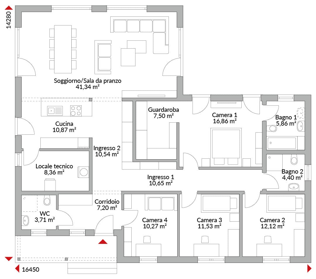 Casa su un piano, quattro camere da letto, pianta ad L, con cabina armadio, con cucina open space, due bagni, bagno di cortesia, locale di servizio, ingresso e due disimpegni. Pensilina d’ingresso integrata. Tetto a due falde con pendenza di 22°.