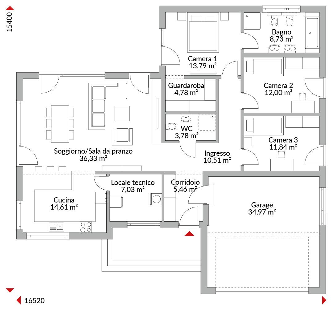 Casa su un piano con pianta ad L, tre camere da letto con garage integrato, cabina armadio, cucina open space, bagno, bagno di cortesia, locale tecnico, ingresso e disimpegno. Pensilina d’ingresso integrata. Tetto a quattro falde (anche detto a padiglione) con pendenza di 25°.