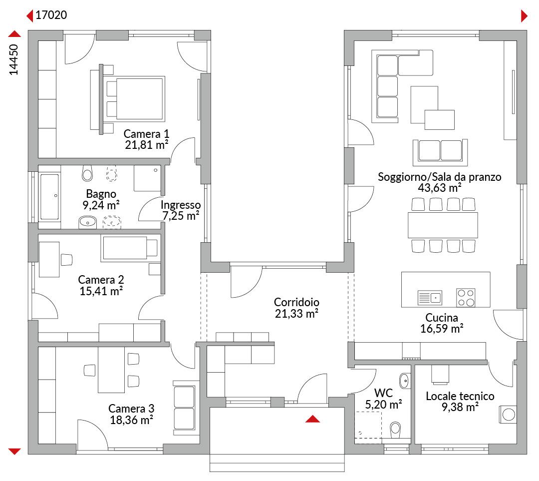 Casa ad un piano con pianta a U, con tre camere da letto, guardaroba, cucina open space, bagno, bagno di cortesia, locale tecnico, ingresso e disimpegno. Pensilina d’ingresso integrata. Combinazione di tetto piano e tetto ad una falda (inclinazione 0°/22°)..