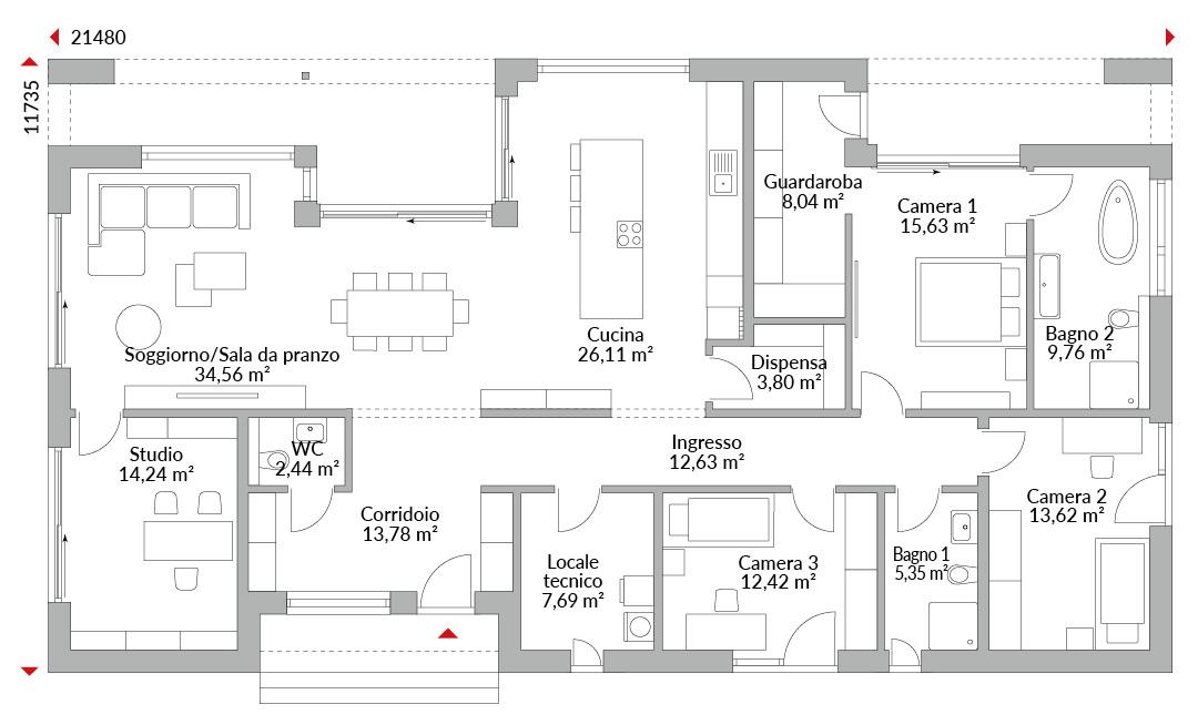 Casa su un piano con ingresso rientrante che protegge la porta d’ingresso rialzata; terrazza nella zona giardino coperta dallo sporto del tetto; zona pranzo rialzata con finestre a tutta altezza, concepita come spazio open space con cucina, dispensa, soggiorno e area pranzo, e porte scorrevoli su terrazzo e giardino; studio indipendente per gli ospiti o utile come home office; tre camere da letto, tra cui una camera padronale con bagno privato e cabina armadio; tutte le camere da letto hanno accesso diretto all’esterno; ulteriore bagno con doccia e bagno di cortesia; locale tecnico, ingresso e disimpegno.