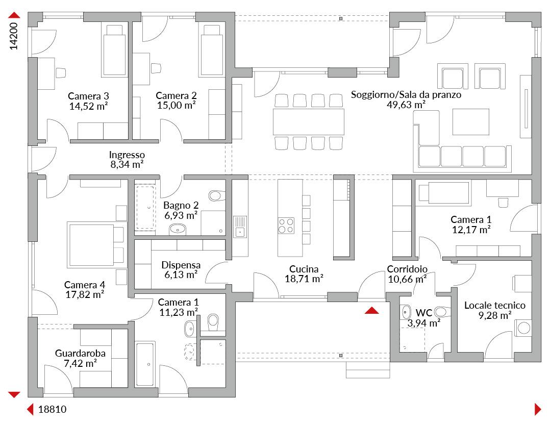 Casa su un piano con quattro camere da letto, cabina armadio, cucina open space, dispensa, due bagni, bagno di cortesia, locale tecnico, ingresso e disimpegno. Pensilina integrata sopra l’ingresso e la terrazza. Tetto a quattro falde (anche detto a padiglione) con pendenza di 25°.