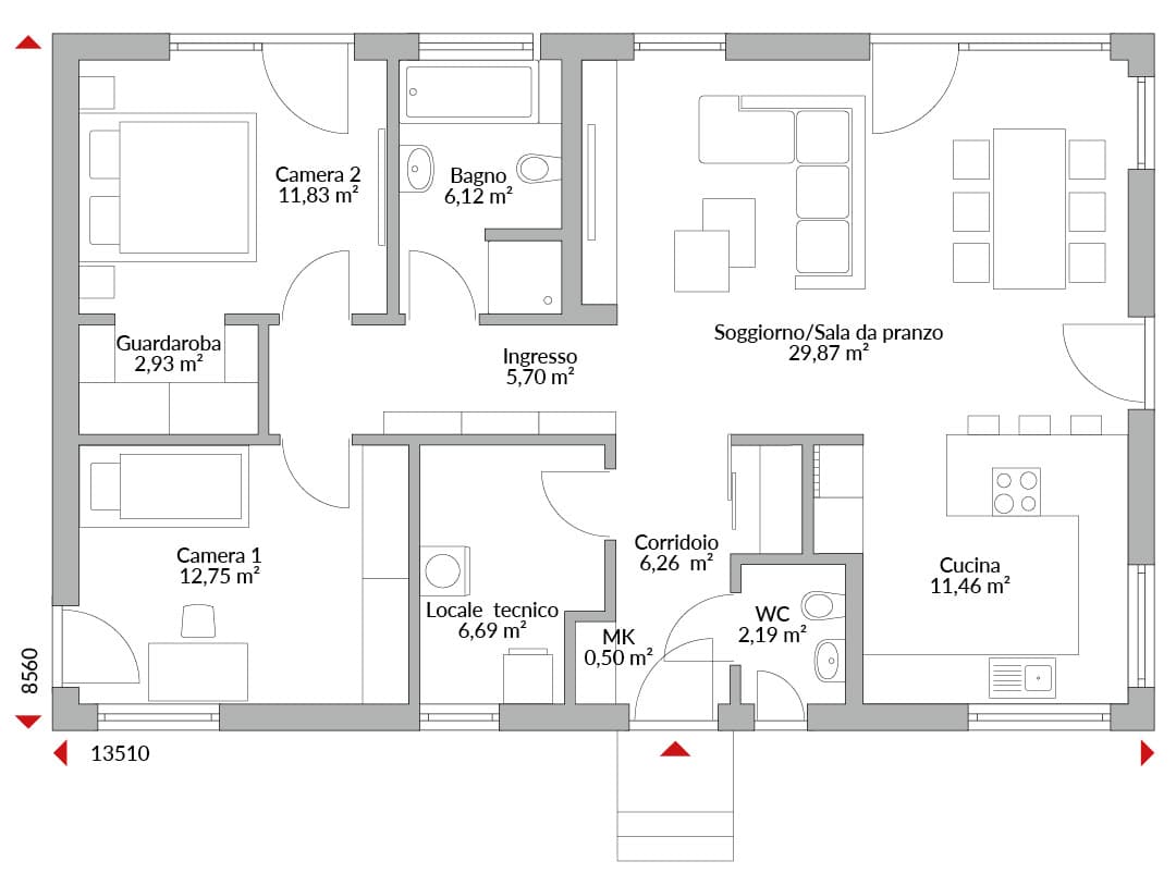 Casa su un piano con due camere, cabina armadio, ingresso, ampia zona giorno open-space con cucina a vista, dispensa, bagno principale con doccia, servizio igienico (WC) separato, locale tecnico, tetto a due falde con inclinazione di 22°.