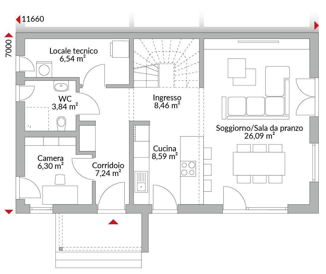 Casa bifamiliare con cinque camere da letto, cabina armadio, cucina, bagno, bagno di cortesia, locale tecnico ed ingresso. Pensilina d’ingresso integrata con tetto piano e parete laterale. Tetto a due falde con pendenza di 25°. Altezza muro sotto falda: 1,75 m. Abbaino con tetto piano.