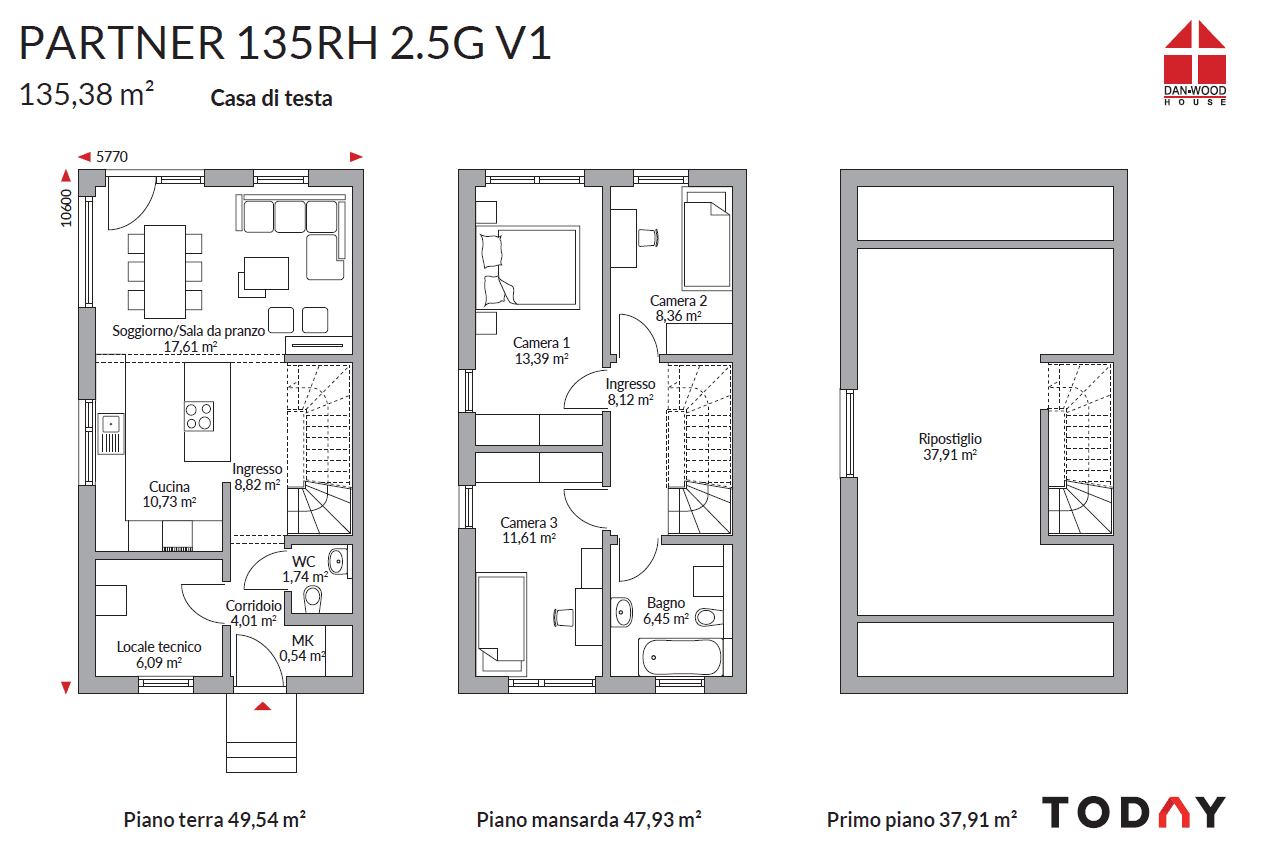 Casa a schiera di due piani con mansarda completamente abitabile, disponibile in due diverse varianti.