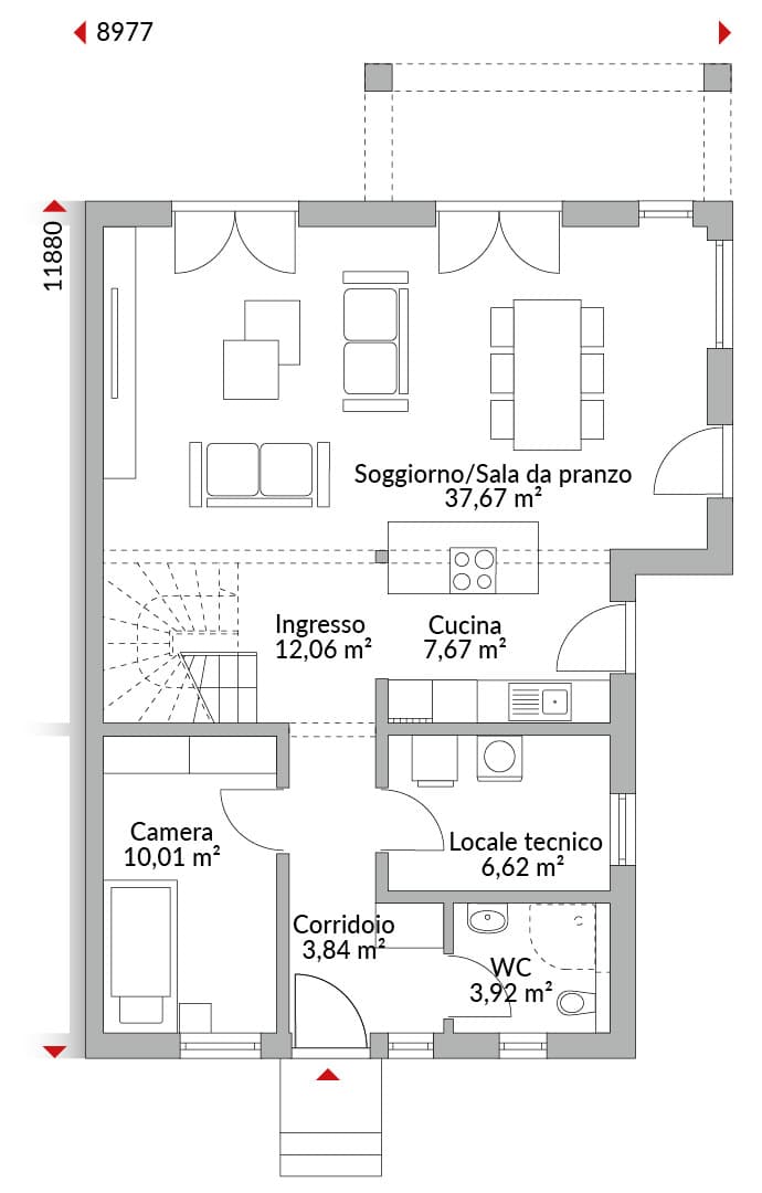 Casa bifamiliare a due piani con sei camere, cabina armadio, cucina, bagno, bagno di cortesia, locale tecnico ed ingresso. Tetto a quattro falde (anche detto a padiglione) con pendenza di 22°. Pensilina integrata sopra la terrazza con tetto piano.