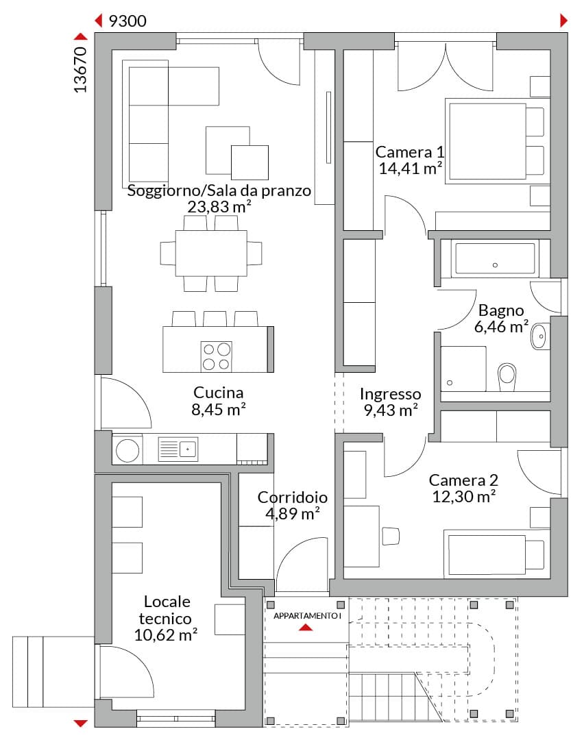 Casa con mansarda abitabile e due appartamenti e ingressi separati per ogni unità. Tetto a due falde con pendenza di 40°. Altezza muro sotto falda: 2,00 m.