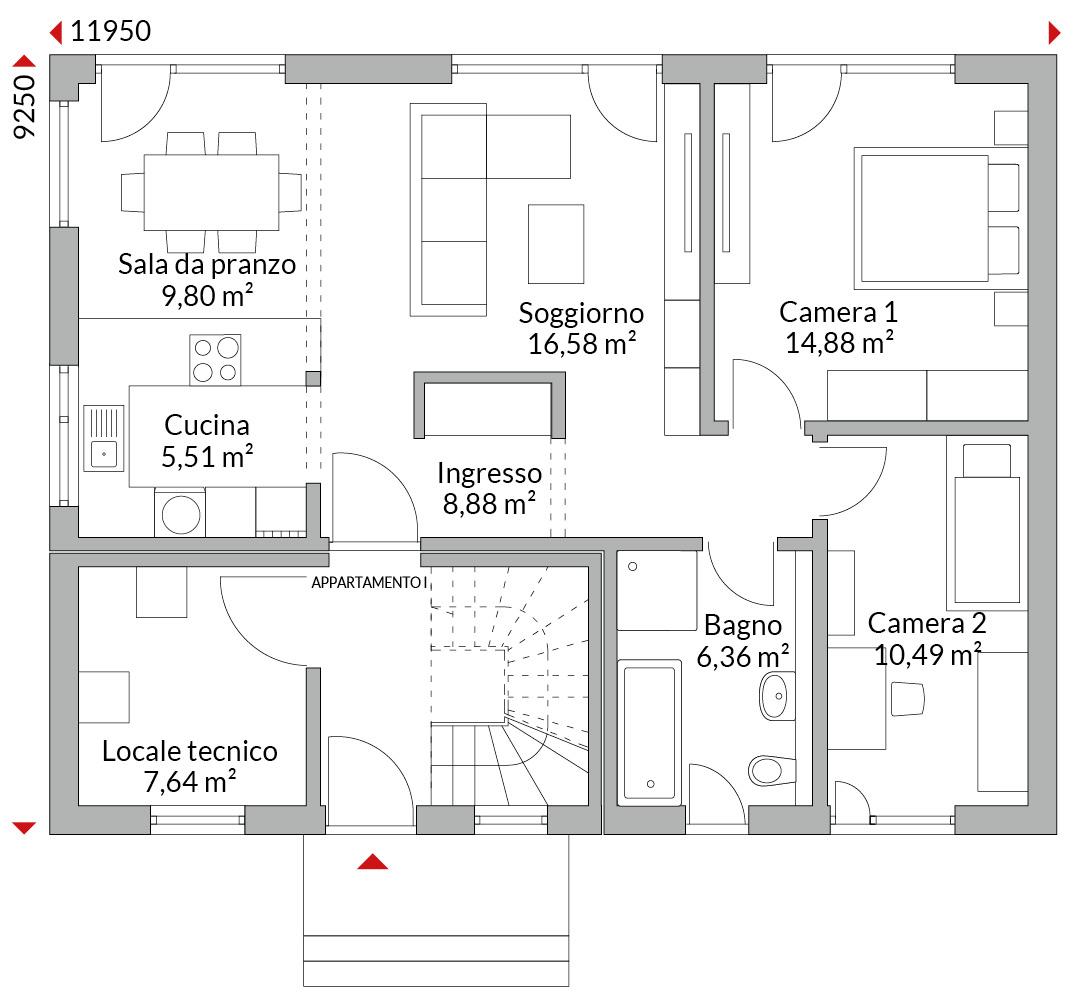 • Appartamento 1 (piano terra): cucina open space, ampia zona soggiorno/pranzo, disimpegno, bagno con vasca, due camere.