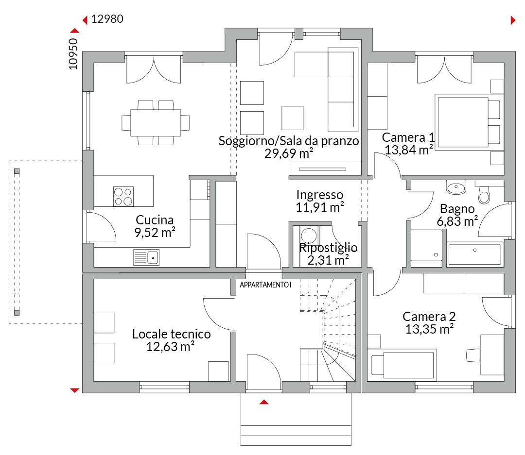 • Appartamento 1 (piano terra): cucina open space, ampia zona soggiorno/pranzo, disimpegno, bagno con vasca, bagno di cortesia, tre camere da letto, terrazzo coperto con parete arretrata.
