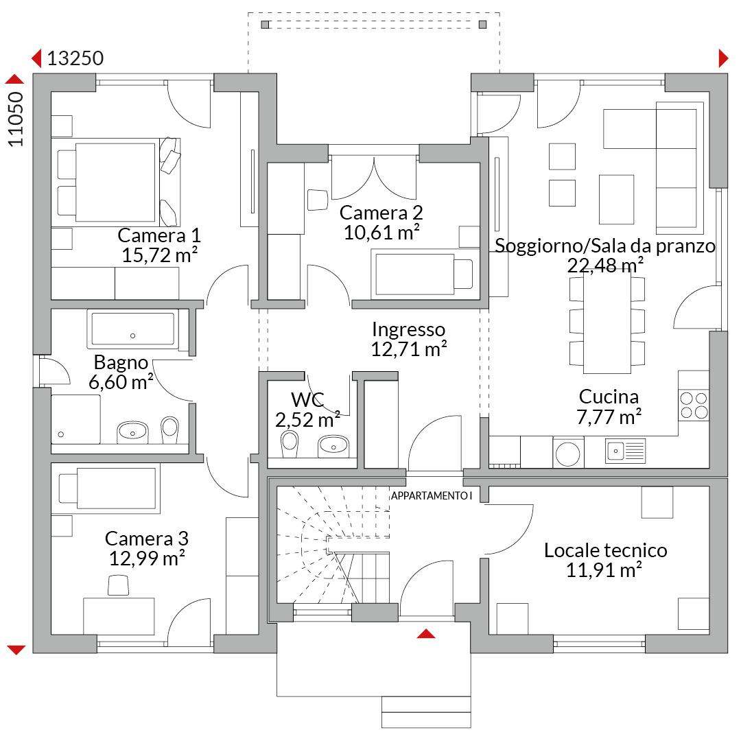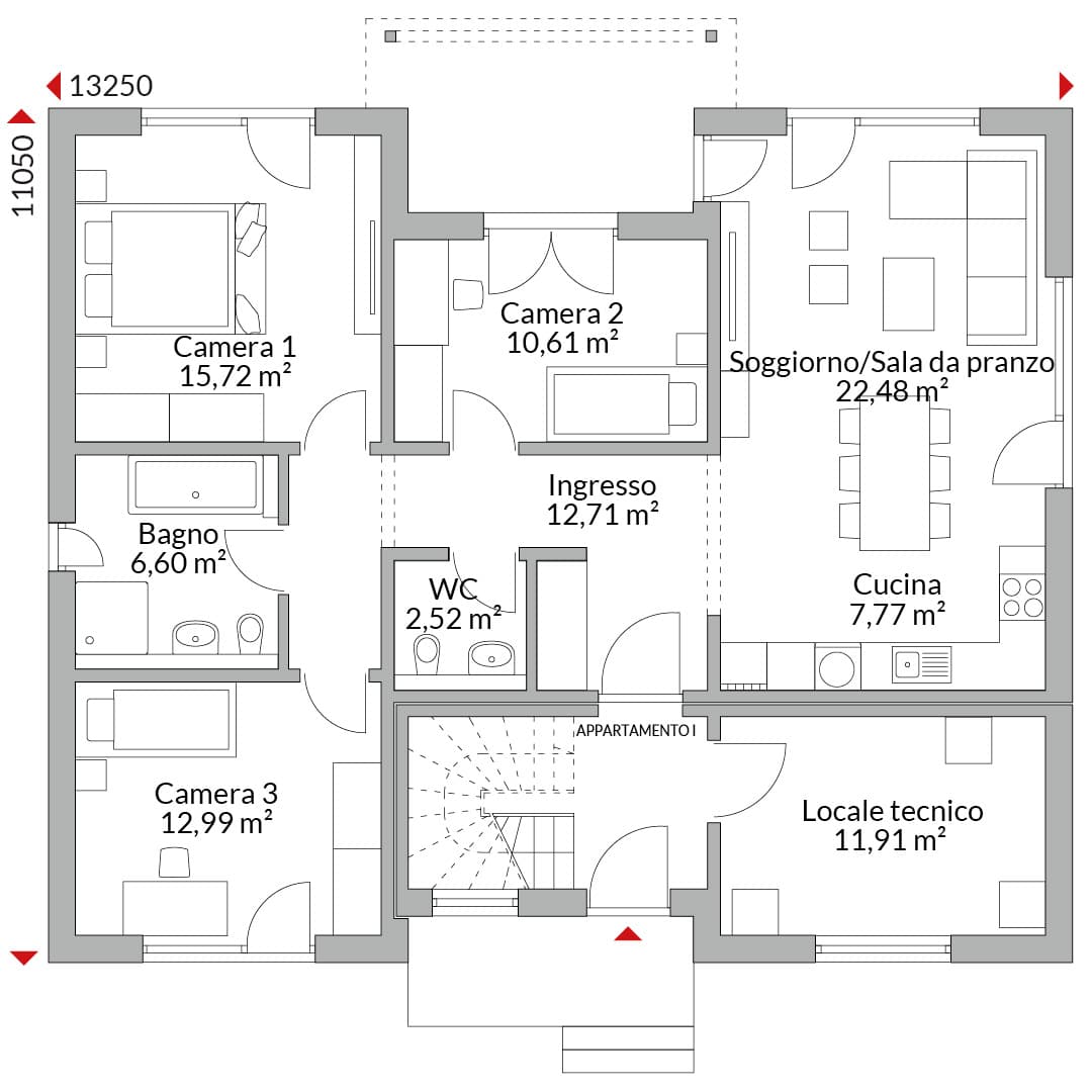 • Appartamento 1 (piano terra): cucina open space, ampia zona soggiorno/pranzo, disimpegno, locale tecnico, bagno con vasca, due camere, terrazzo coperto.