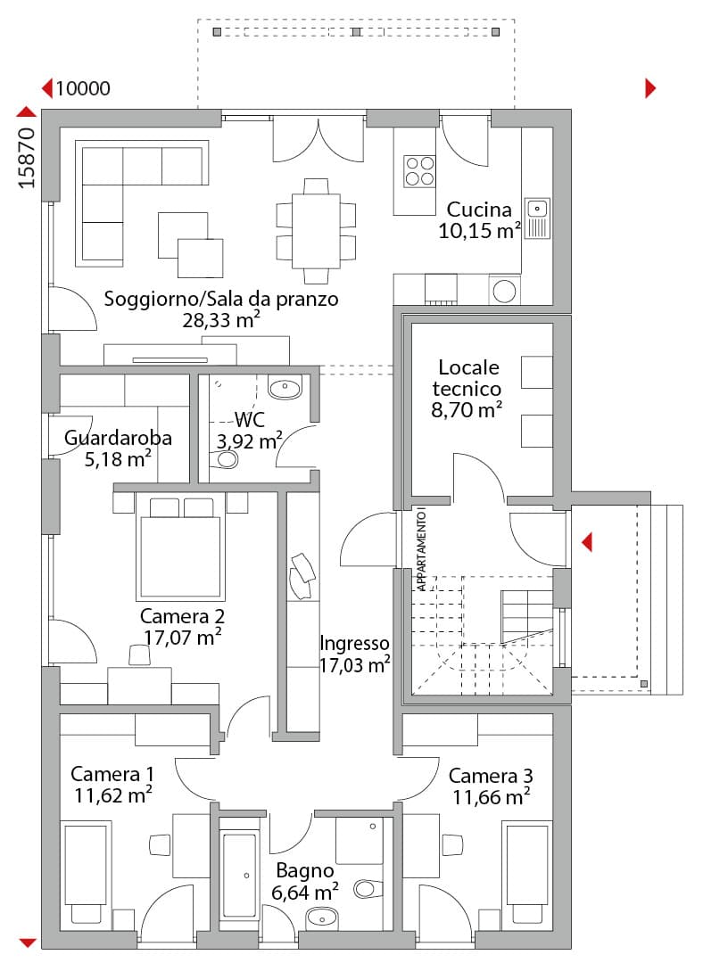 Casa con mansarda abitabile e due appartamenti. Tetto a due falde con pendenza di 35°. Altezza muro sotto falda: 1,75 m.