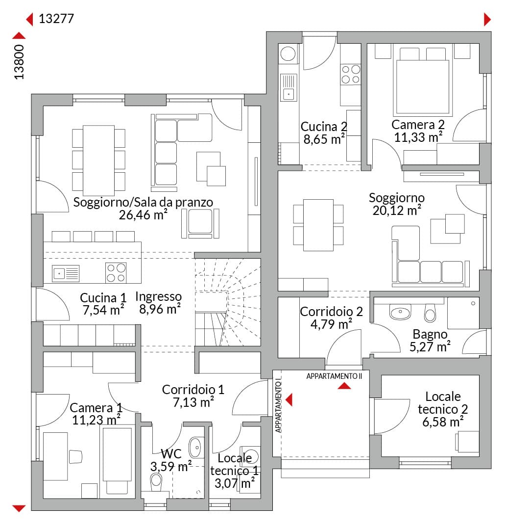 Casa con mansarda abitabile con cinque camere, cabina armadio, ripostiglio, cucina open space, bagno, bagno di cortesia, ingresso, e locale tecnico. Copertura principale: tetto a due falde in stile mansardato con inclinazione di 30°. Altezza muro sotto falda: 1,75 m. Copertura dell’ampliamento: tetto piano.