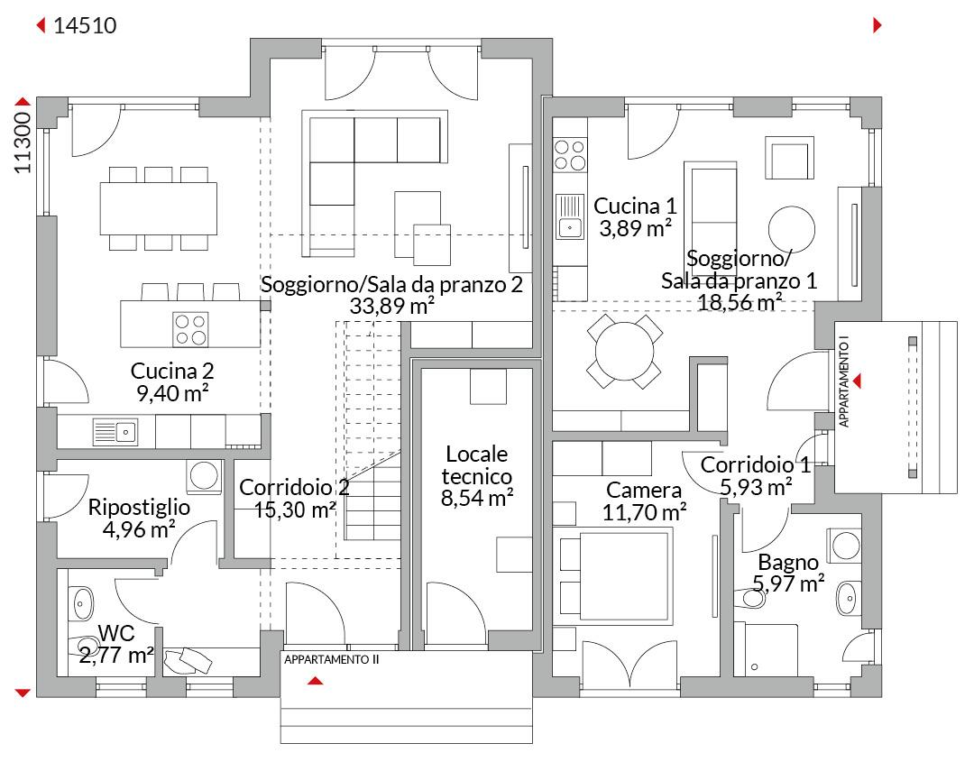 Casa a schiera su due livelli con due appartamenti e ingressi separati. Locale tecnico condiviso, accessibile dall’esterno. Tetto a quattro falde (anche detto a padiglione) con pendenza di 20°.