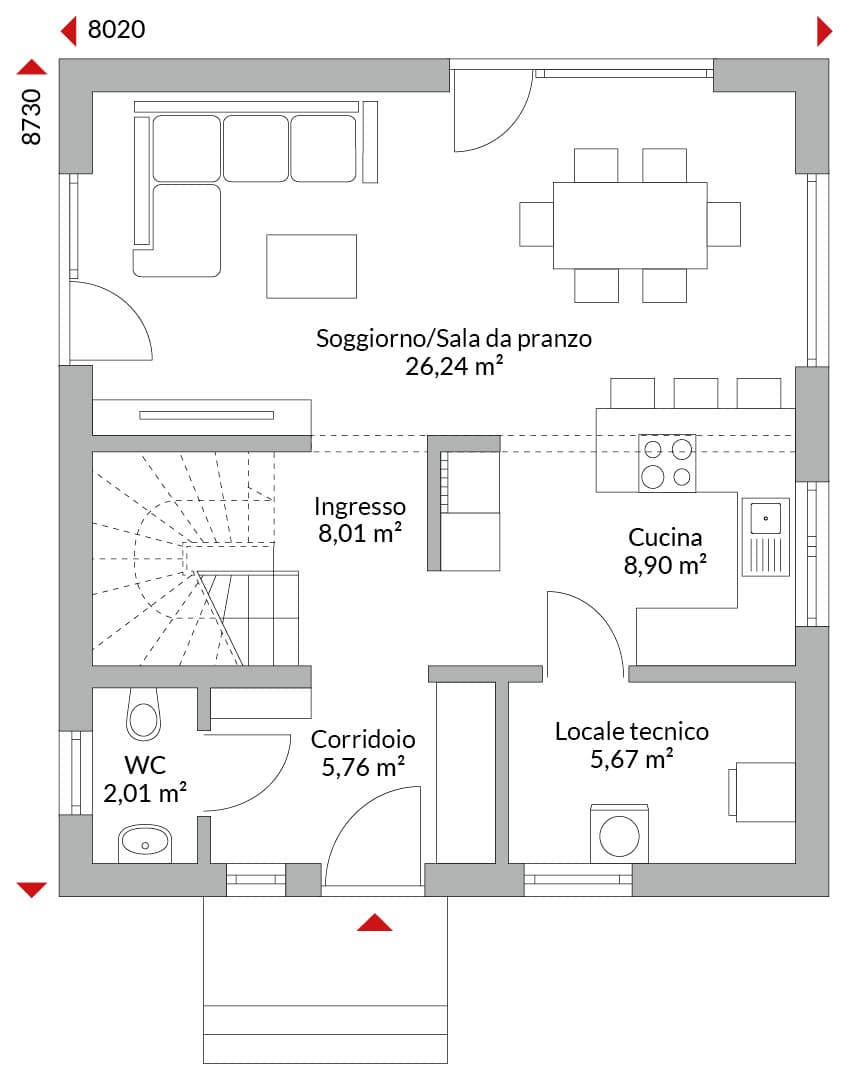Casa con mansarda abitabile con quattro camere, cucina open space, bagno, bagno di cortesia, ingresso, disimpegno e locale tecnico. Tetto a due falde con pendenza di 40°. Altezza muro sotto falda: 1,00 m.