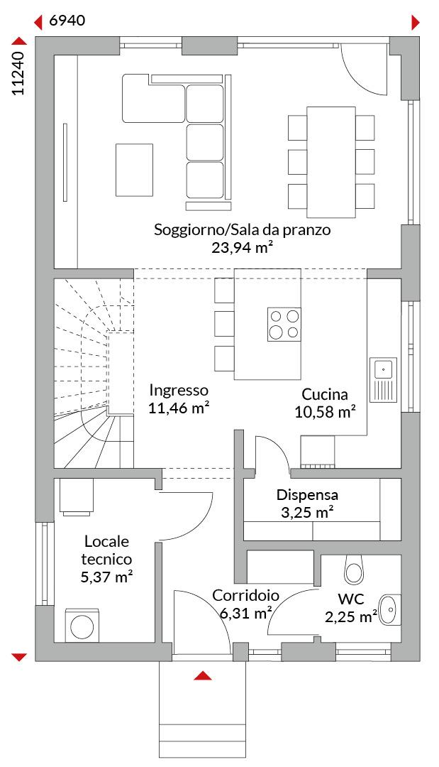 Casa con mansarda abitabile con quattro camere, due cabine armadio, cucina open space, dispensa, bagno, bagno di cortesia, ingresso, disimpegno e locale tecnico. Tetto a due falde con pendenza di 40°. Altezza muro sotto falda: 1,50 m.
