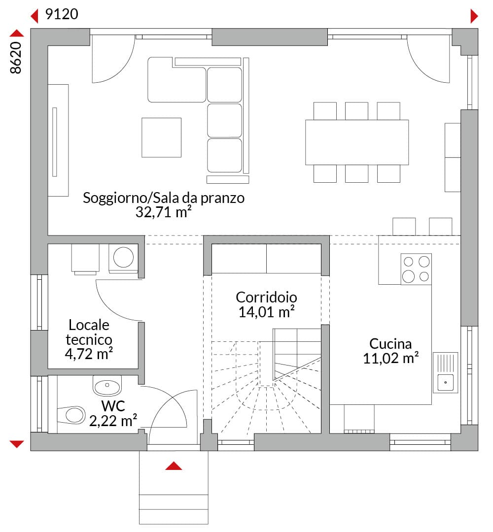 Casa con mansarda abitabile con quattro camere, cucina open space, bagno, bagno di cortesia, ingresso, disimpegno e locale tecnico. Tetto a due falde con pendenza di 40°. Altezza muro sotto falda: 0,75 m.