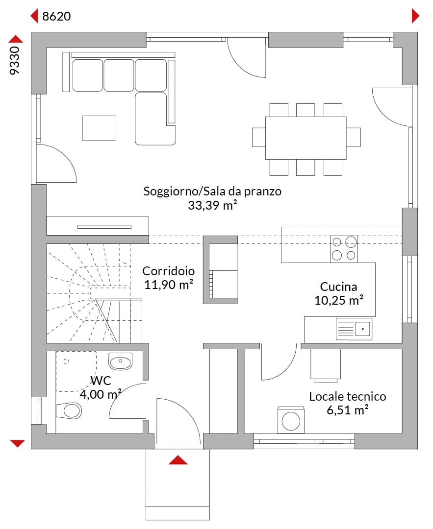 Casa con mansarda abitabile con quattro camere, cucina open space, bagno, bagno di cortesia, locale tecnico and ingresso. Tetto a due falde con pendenza di 40°. Altezza muro sotto falda: 0,75 m.