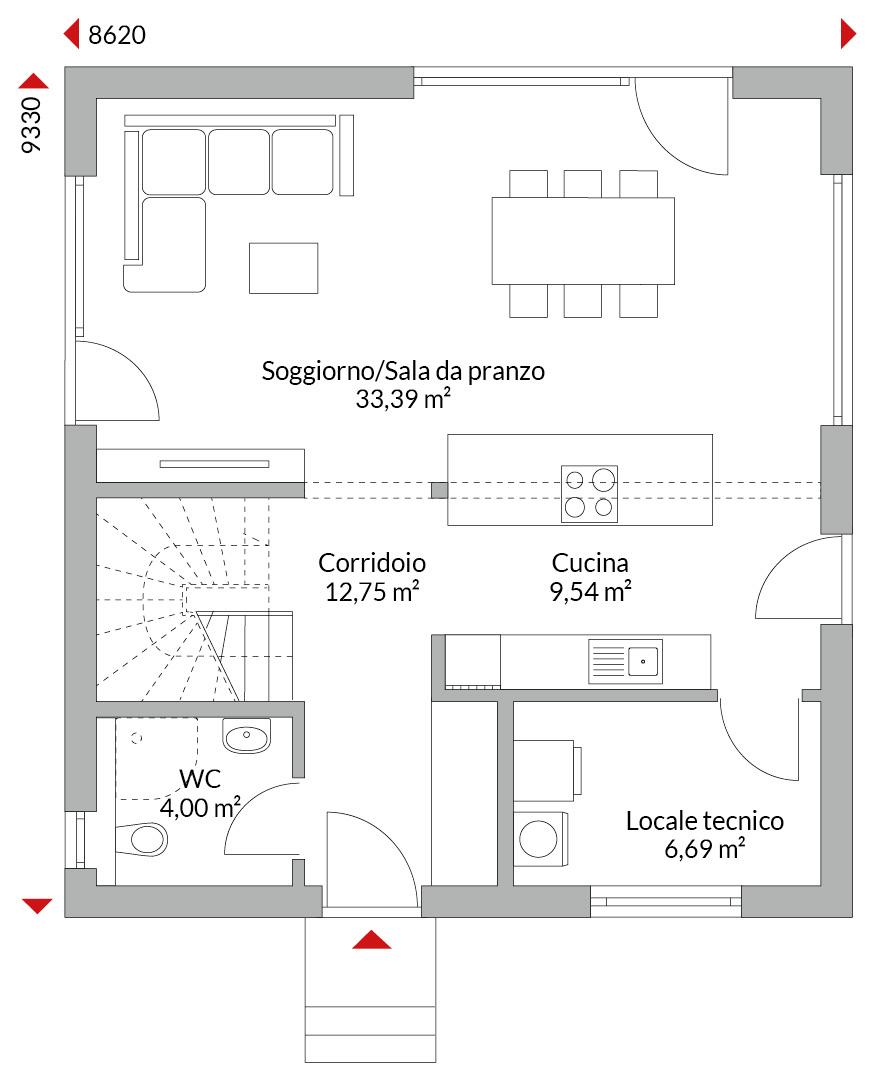 Casa con mansarda abitabile con quattro camere, cucina open space, bagno, bagno di cortesia, locale tecnico and ingresso. Tetto a due falde con pendenza di 45°. Altezza muro sotto falda: 0,75 m. Facciata standard con intonaco bianco.