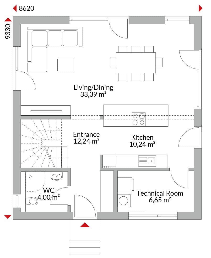 Casa con mansarda abitabile con abbaino trasversale, quattro camere, cucina open space, bagno, bagno di cortesia, locale tecnico ed ingresso. Tetto a due falde con pendenza di 40° (tetto a due falde trasversale 35°). Altezza muro sotto falda: 0,75 m.