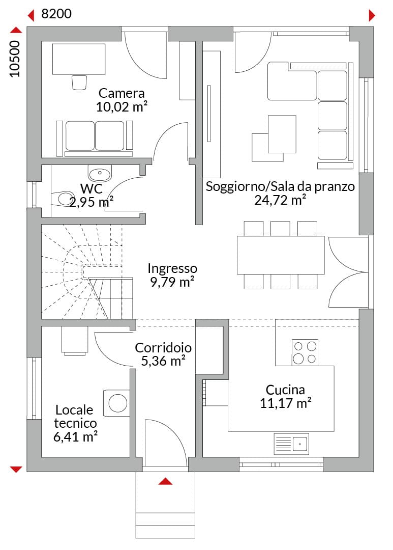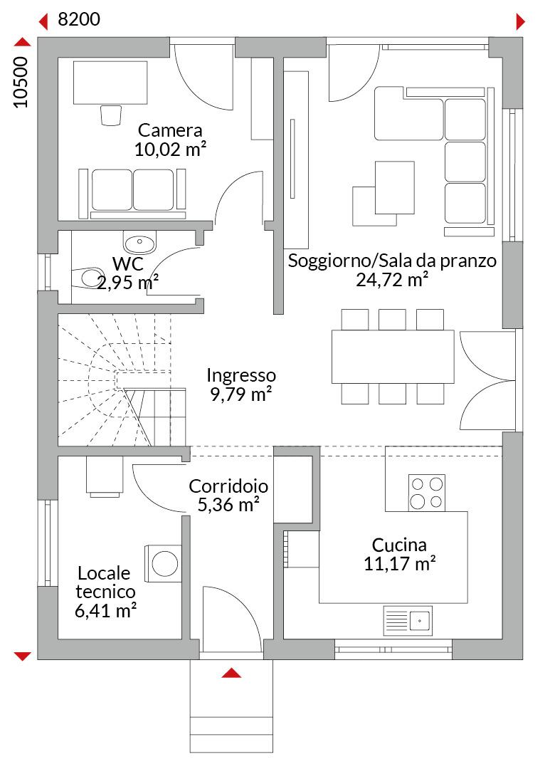 Casa con mansarda abitabile con cinque camere, cabina armadio, cucina open space, bagno, bagno di cortesia, ingresso, disimpegno e locale tecnico. Tetto a due falde con pendenza di 40°. Altezza muro sotto falda: 1,25 m.