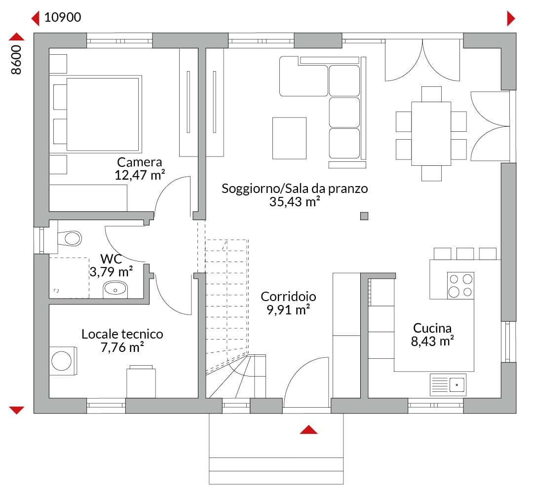 Casa con mansarda abitabile con quattro camere, cucina open space, bagno, bagno di cortesia, locale tecnico, ingresso e disimpegno. Tetto a due falde con pendenza di 45°. Altezza muro sotto falda: 0,75 m.