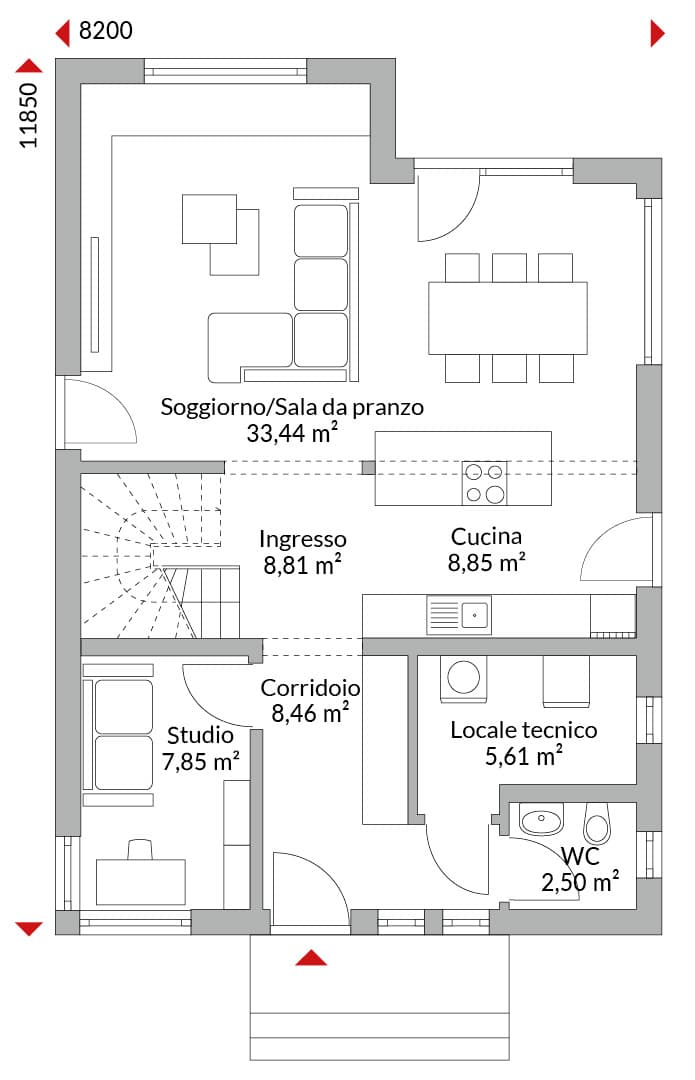 Casa con mansarda abitabile con cinque camere, cabina armadio, cucina open space, bagno, bagno di cortesia, ingresso, disimpegno e locale tecnico. Tetto a due falde con pendenza di 30°. Altezza muro sotto falda: 1,75 m.