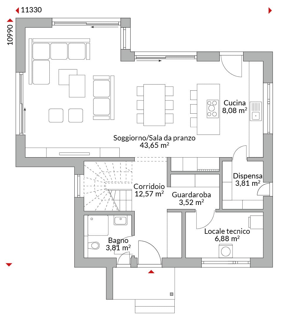 Casa con mansarda abitabile, pensilina sopra la porta d’ingresso preceduta da alcuni gradini e due camere al piano superiore. Ampie vetrate a tutta altezza con balconcini alla francese. Camera padronale con ampia cabina armadio. Piano terra rialzato con bovindo vetrato e ampie superfici vetrate a tutta altezza, concepito come zona giorno open space con cucina/pranzo/soggiorno e porte scorrevoli sulla terrazza. Bagno di cortesia con doccia, bagno con vasca, doccia e doppio lavabo, locale tecnico, ingresso con zona guardaroba e disimpegno. Tetto a due falde con ampi sporti di gronda (60 cm), pendenza di 30°. Altezza muro sotto falda: 1,50 m.