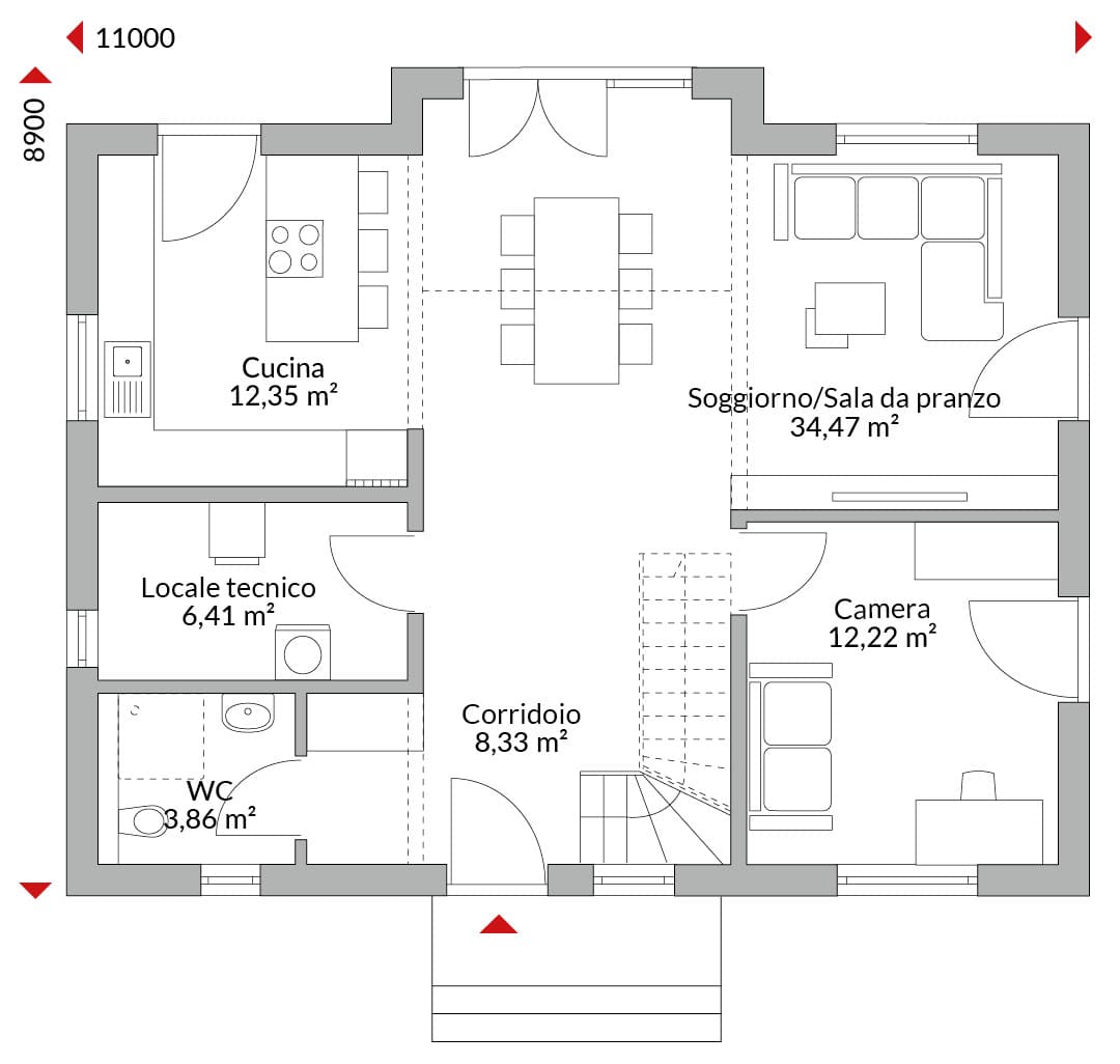 Casa con mansarda abitabile con cinque camere, cabina armadio, cucina open space, due bagni, bagno di cortesia, ingresso, disimpegno e locale tecnico. Tetto a due falde con pendenza di 30°. Altezza muro sotto falda: 1,50 m.