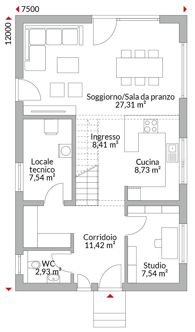 Casa con mansarda abitabile con quattro camere, cabina armadio, studio, cucina open space, due bagni, bagno di cortesia, ingresso, disimpegno e locale tecnico. Tetto a due falde con pendenza di 30°. Altezza muro sotto falda: 1,75 m.
