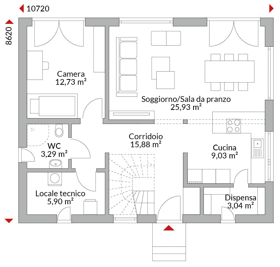 Casa con mansarda abitabile con due abbaini trasversali, cinque camere da letto, cabina armadio, cucina open space, dispensa, bagno, bagno di cortesia, locale tecnico e ingresso. Tetto a due falde con pendenza di 40° (tetto a due falde trasversale 35°). Altezza muro sotto falda: 1,00 m.