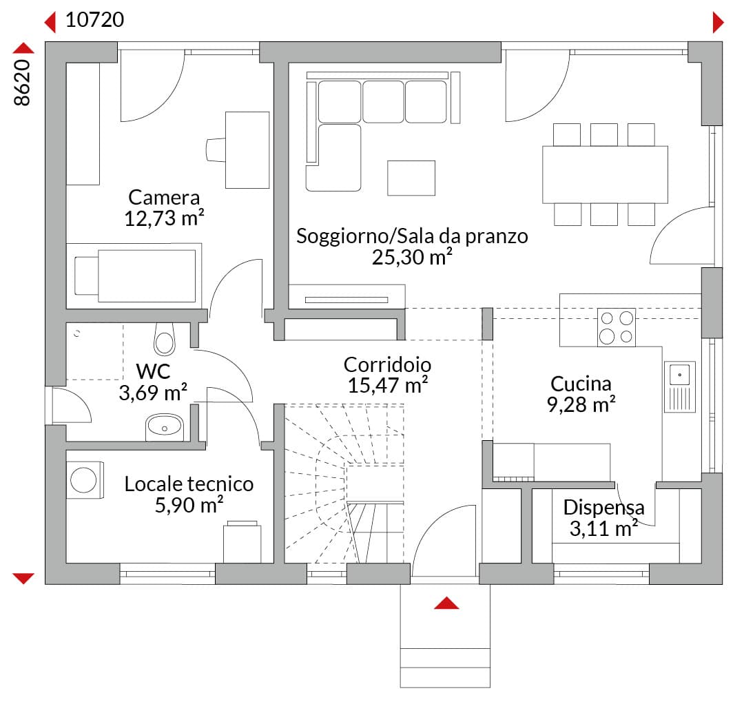 Casa con mansarda abitabile con sei camere, cucina open space, dispensa, bagno, bagno di cortesia, ingresso, disimpegno e locale tecnico. Tetto a due falde con pendenza di 40°. Altezza muro sotto falda: 0,75 m.