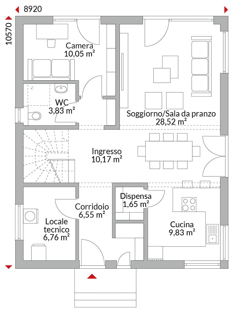 Casa con mansarda abitabile con cinque camere, cabina armadio, cucina open space, dispensa, bagno, bagno di cortesia, locale tecnico, ingresso e disimpegno. Tetto a due falde con pendenza di 40°. Altezza muro sotto falda: 0,75 m.
