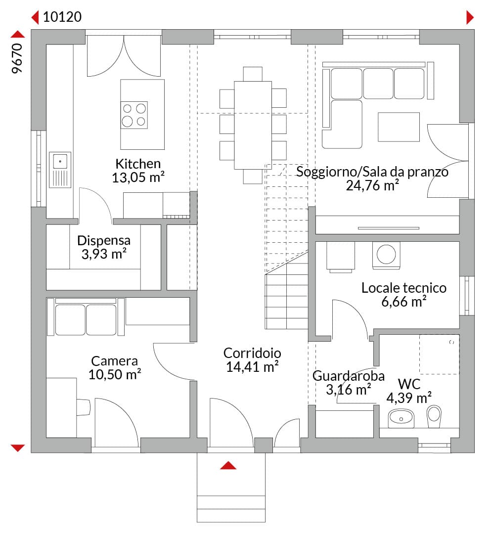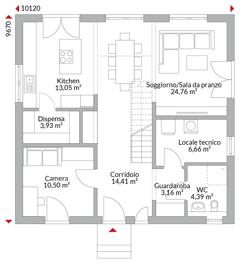 Casa con mansarda abitabile con cinque camere, cabina armadio, cucina open space, dispensa, bagno, bagno di cortesia, ingresso, disimpegno e locale tecnico. Tetto a due falde con pendenza di 40°. Altezza muro sotto falda: 1,00 m.